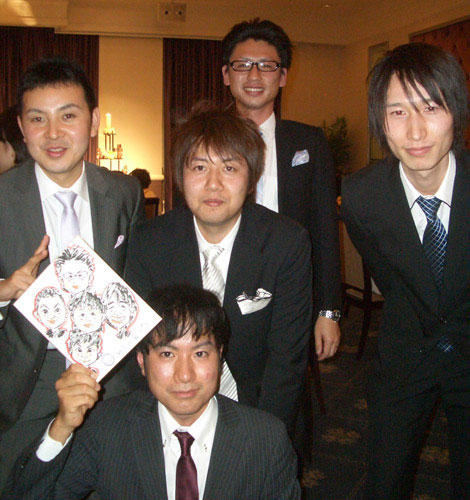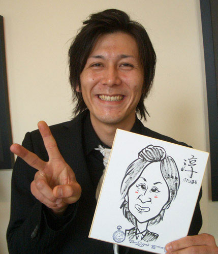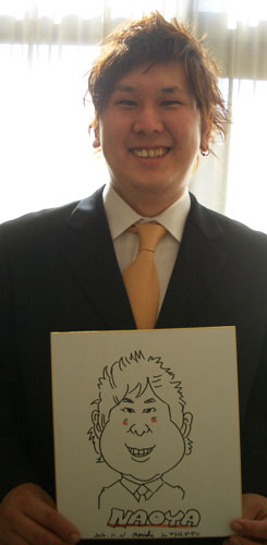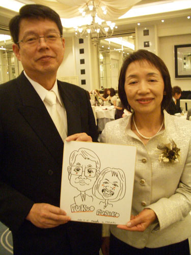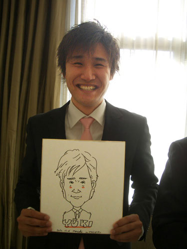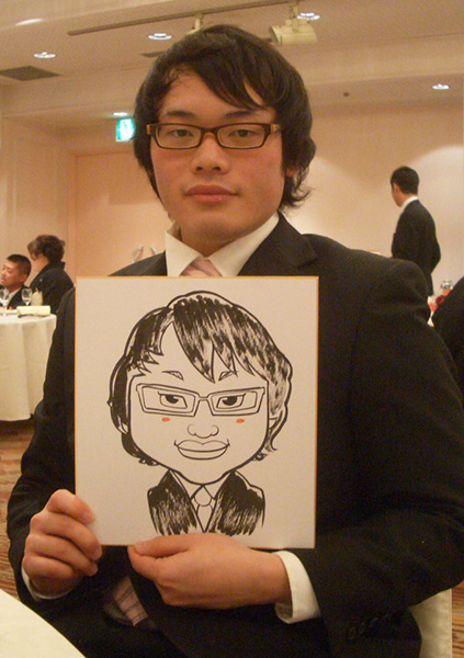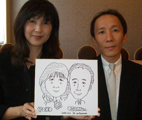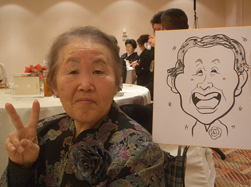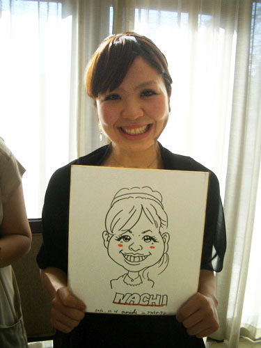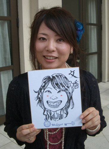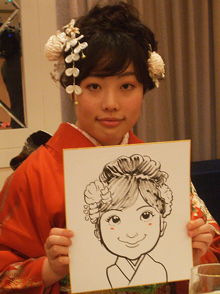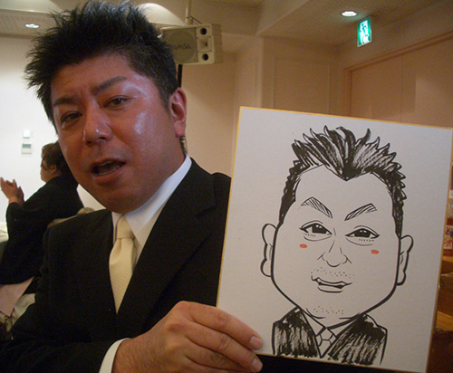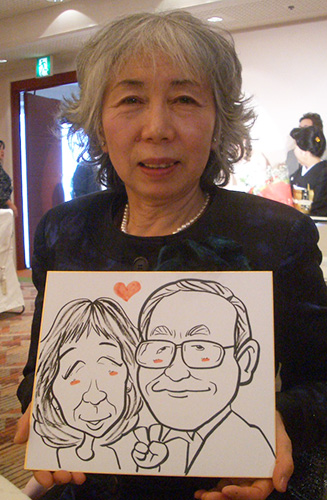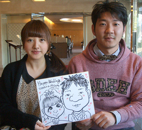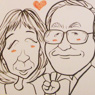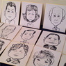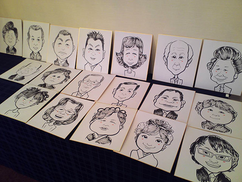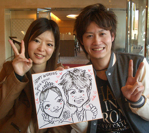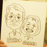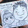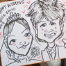 結婚式の似顔絵ライブとは結婚式に出張し、列席者様の似顔絵をその場でお描きし、その場でお渡しするものです。パフォーマンスと引き出物の両方を兼ね備えたサプライズになります。できた似顔絵を互いに見せ合ったりして、式が盛り上がる事間違いありません。列席者様同士を巻き込んだあたたかくてユーモアたっぷりなセレモニーになります。