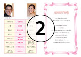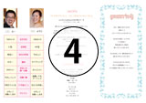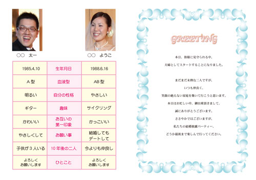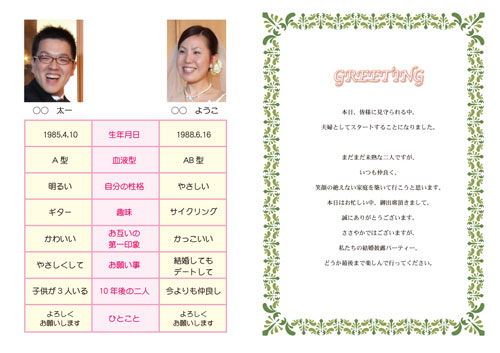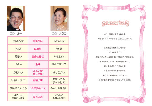 厚手の紙のおもてに表紙を印刷。中紙の片面に席次表を印刷。裏面にプロフィールと挨拶を印刷。