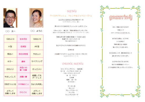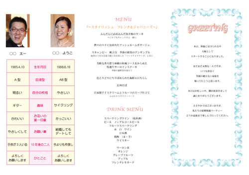 厚手の紙のおもてに表紙を印刷。中紙の片面に席次表を印刷。裏面にプロフィールと挨拶、当日の料理のメニュー表を印刷。